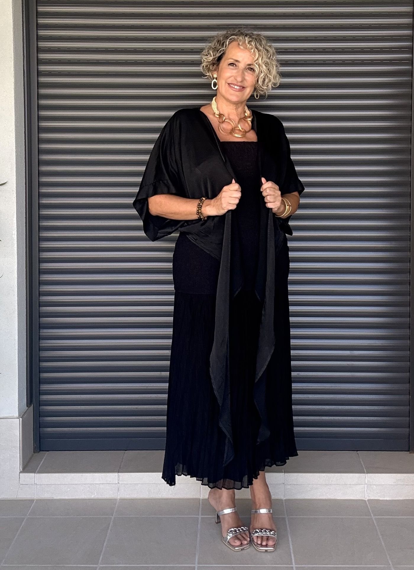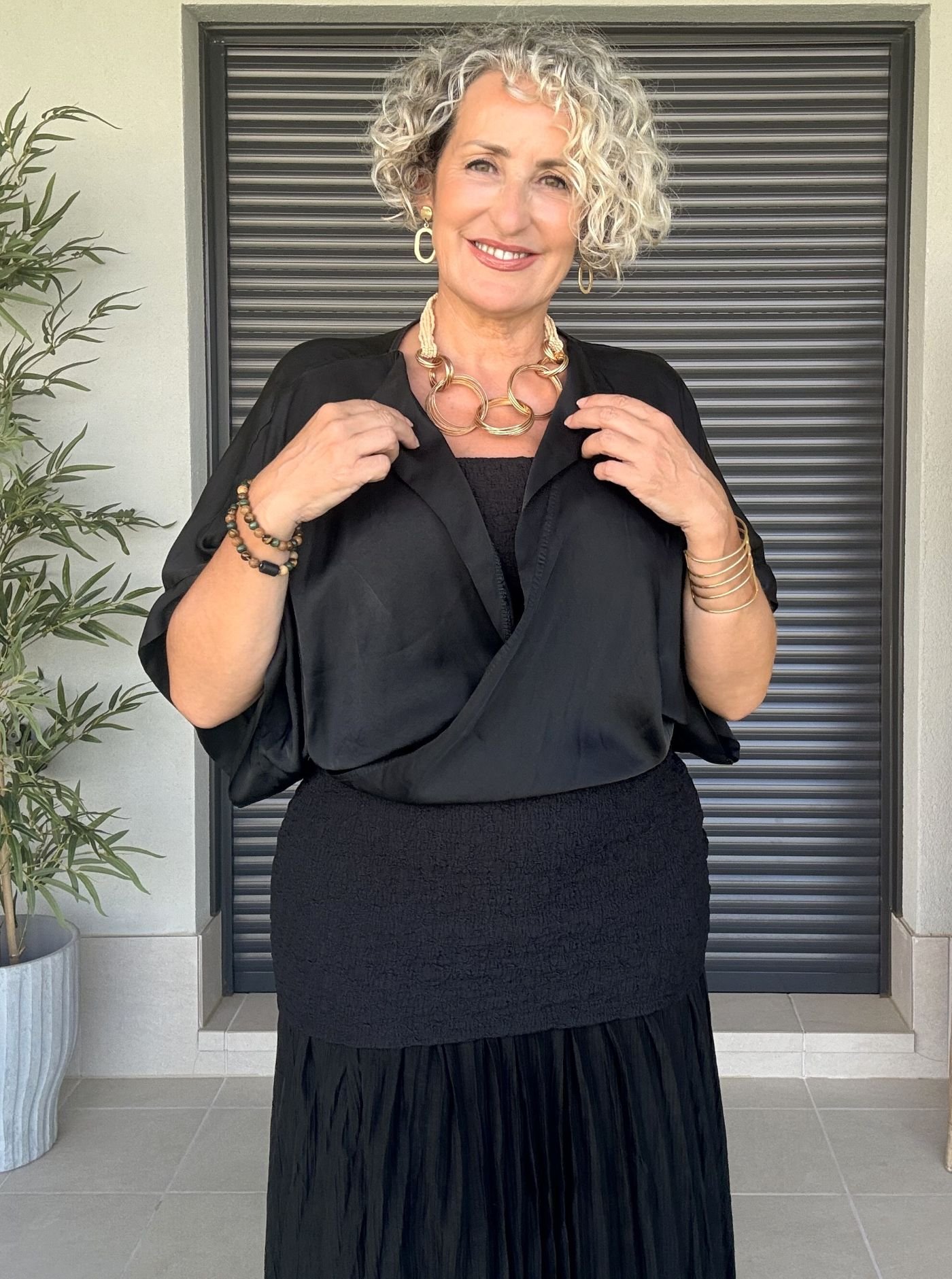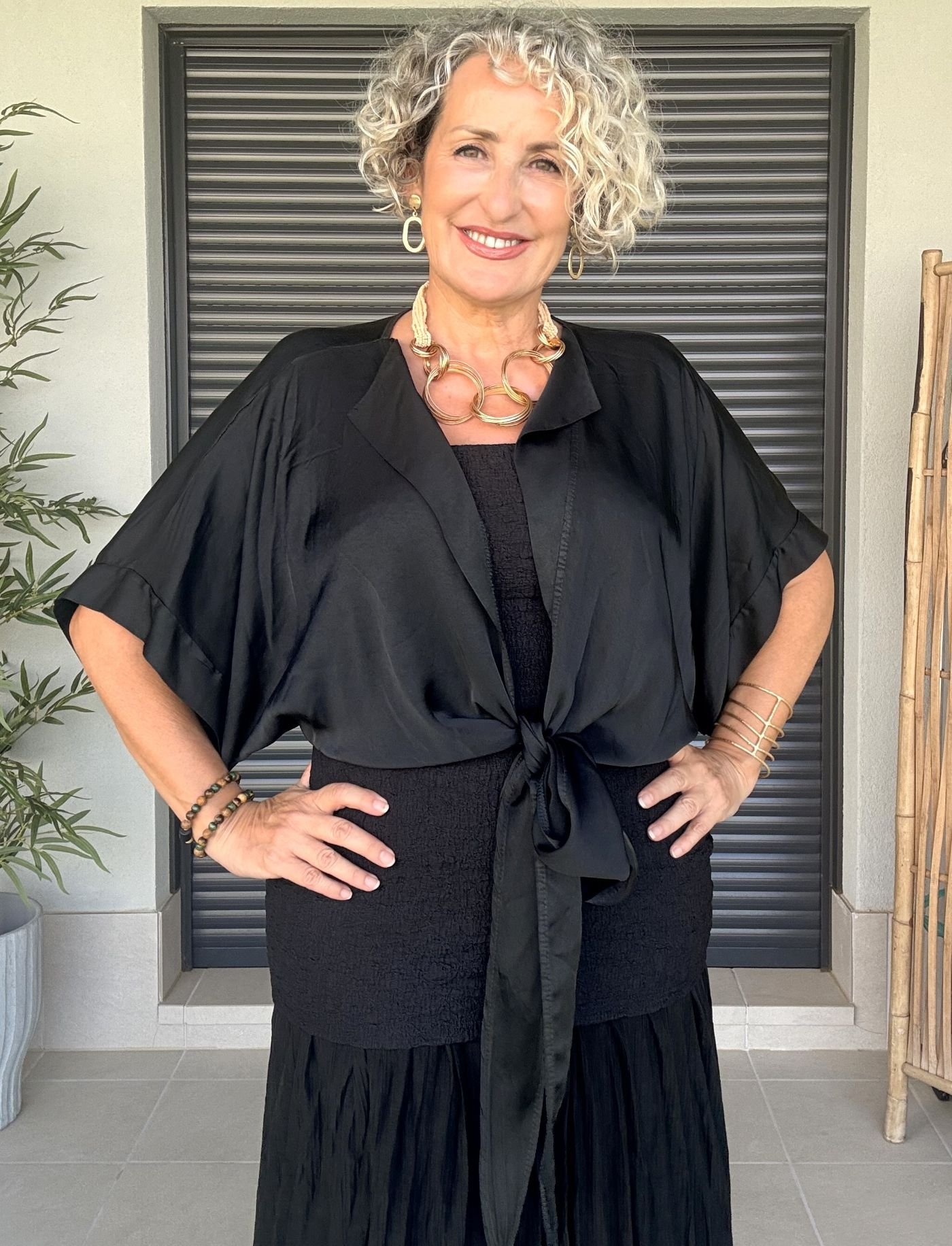 Camisa negra satinada multiposición. Manga al codo ancha y ligera. Versátil, elegante y fácil de combinar en múltiples looks. Talla única de 36 a 44.