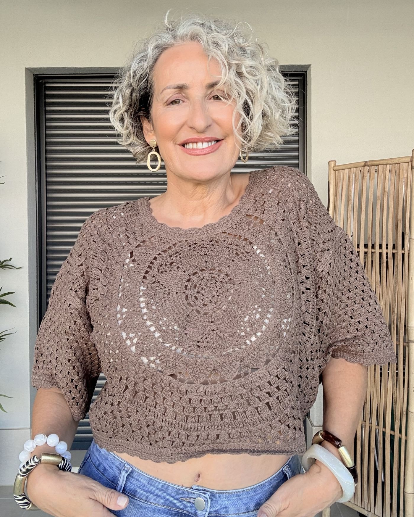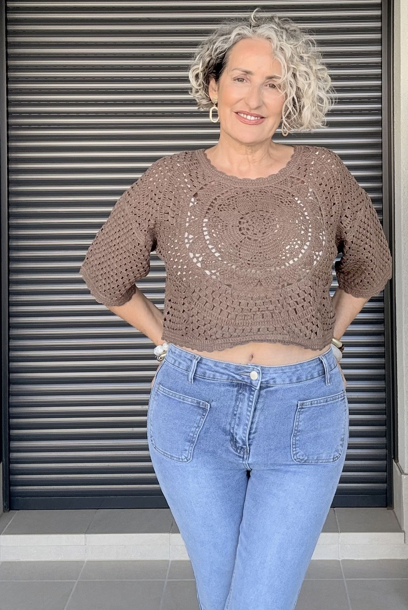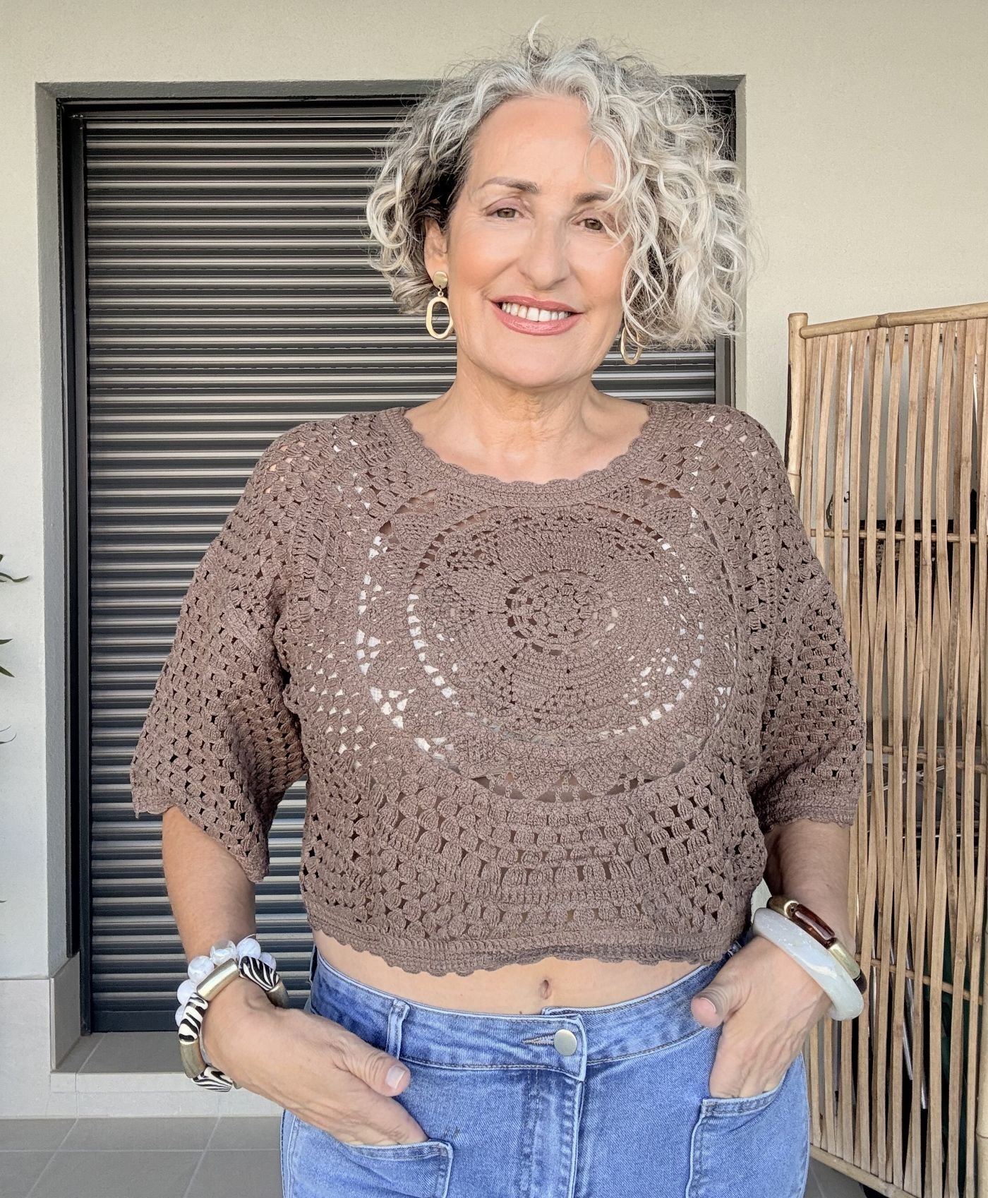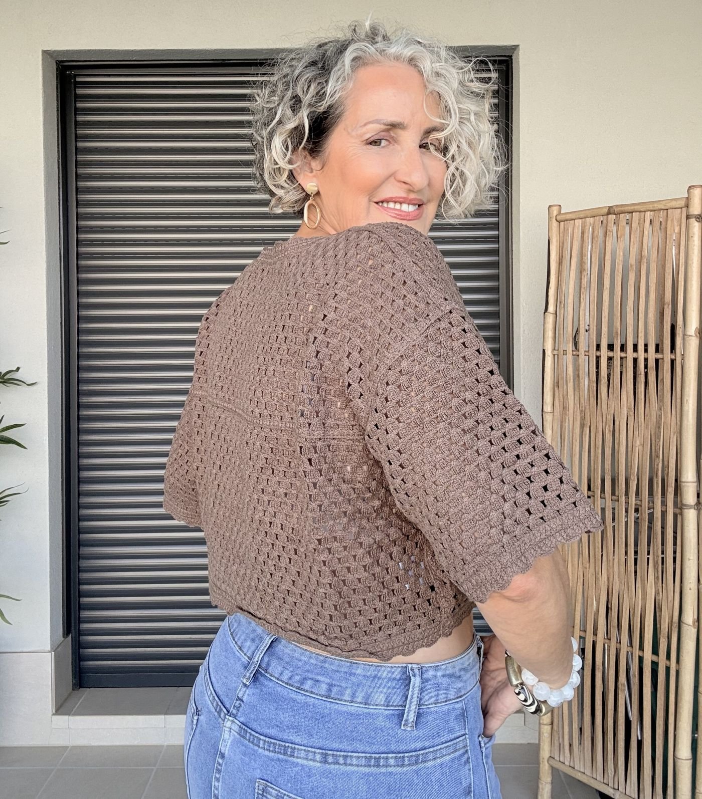 Jersey de crochet en color café, cuello a la caja, manga corta ancha y corte a la cintura. Talla única (36-42). Fresco, versátil y fácil de combinar.